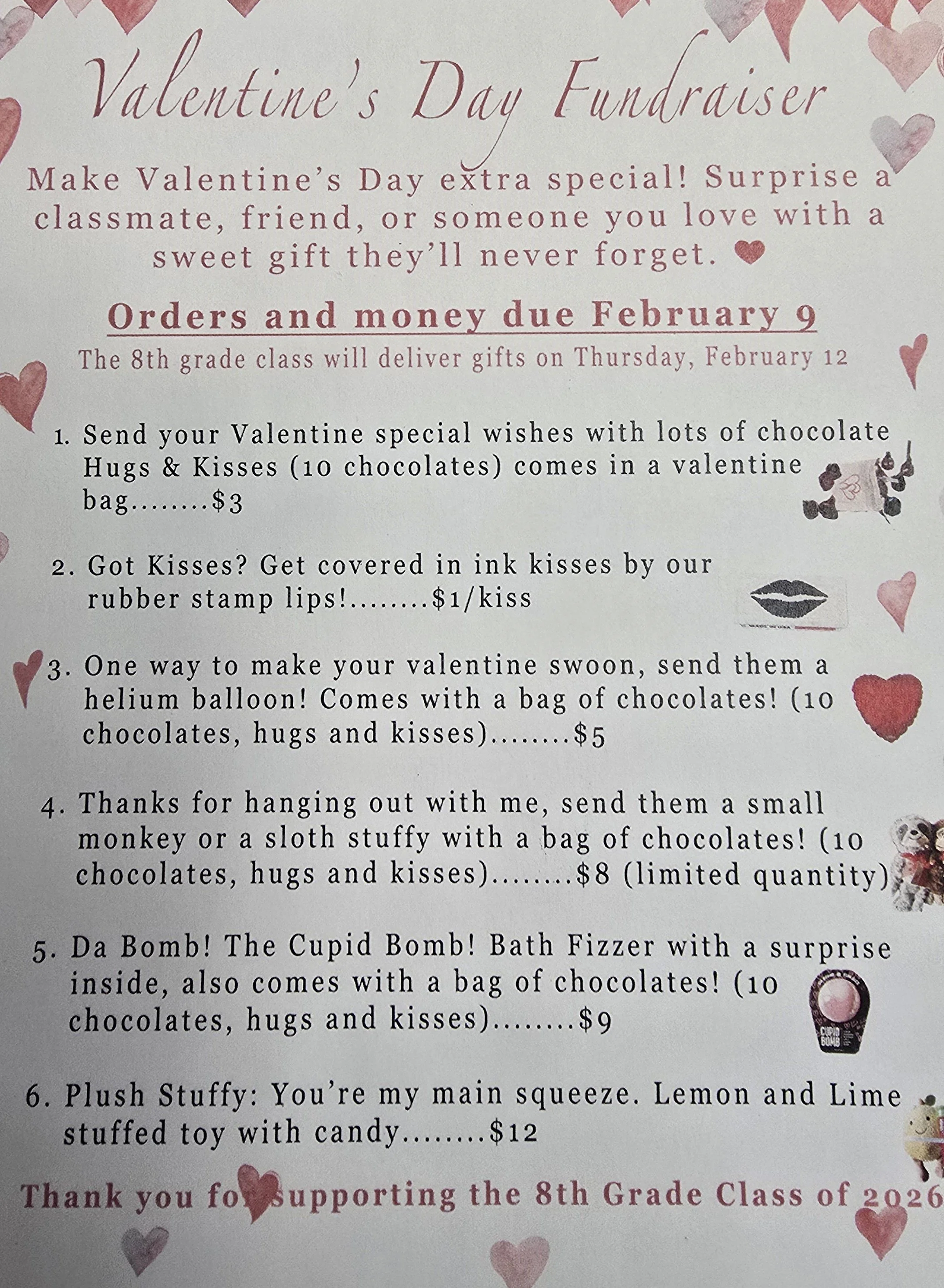 If you would like to support our 8th grade class, ask your student about the ECA Valentines packet that was sent out in late January.