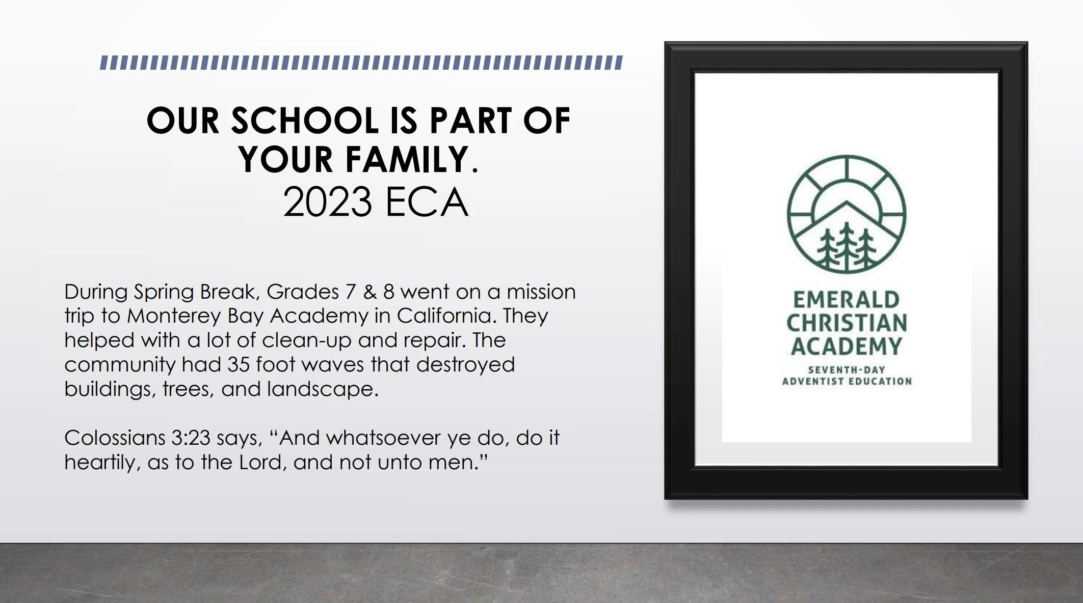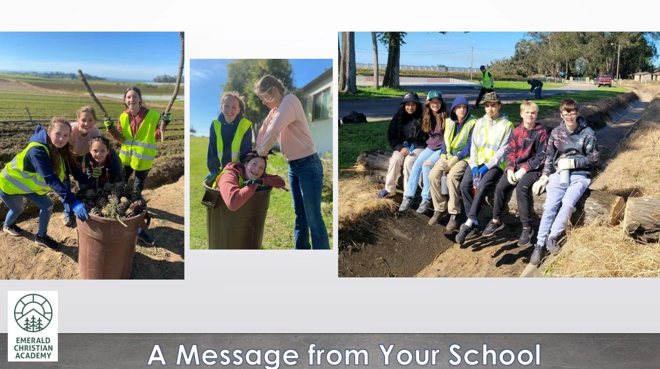 Students in grades 7&8 spent their Spring Break working at Monterey Bay Academy in central California. Mr. Gaylor and Ms. Sobor, the mission trip sponsors, worked alongside several parents who also came to volunteer their time. This area was hit by waves as high as 35 feet during the winter storms. The school worked with Build and Restore International. This Adventist organization works all over the world to bring hope, restoration, and the message of the gospel. You can see more about our trip from the pictures below or video links.