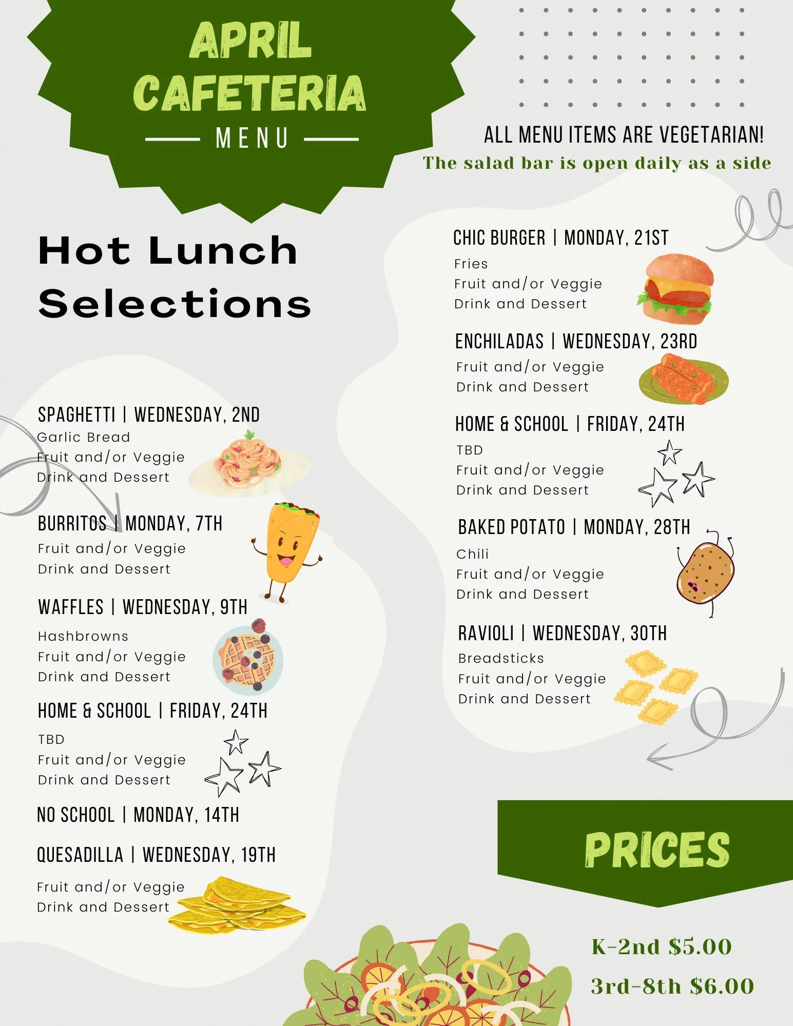 Hot lunch happens every Monday and Wednesday. Additionally, whenever we have a 1/2 Friday, hot lunch will be offered by our Home & School. You can click on the link below to order hot lunch for the week for your child. If you have more than one child, please click the link more than once and turn in one week’s submission for each child. There is a payment option that is included in the form.